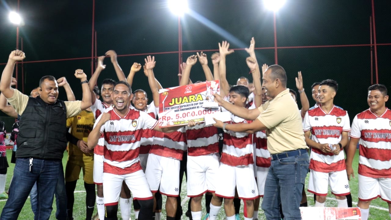 Kupasan.com – Tim Satsamapta Polresta Banda Aceh akhirnya keluar sebagai juara pertama dalam turnamen mini soccer Kapolresta Banda Aceh Cup Tahun 2025, yang digelar dalam memperingati Hari Bhayangkara ke- 79 sejak tanggal 19 – 22 Juni 2025 dengan menghadirkan 16 klub se Polresta Banda Aceh.